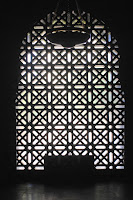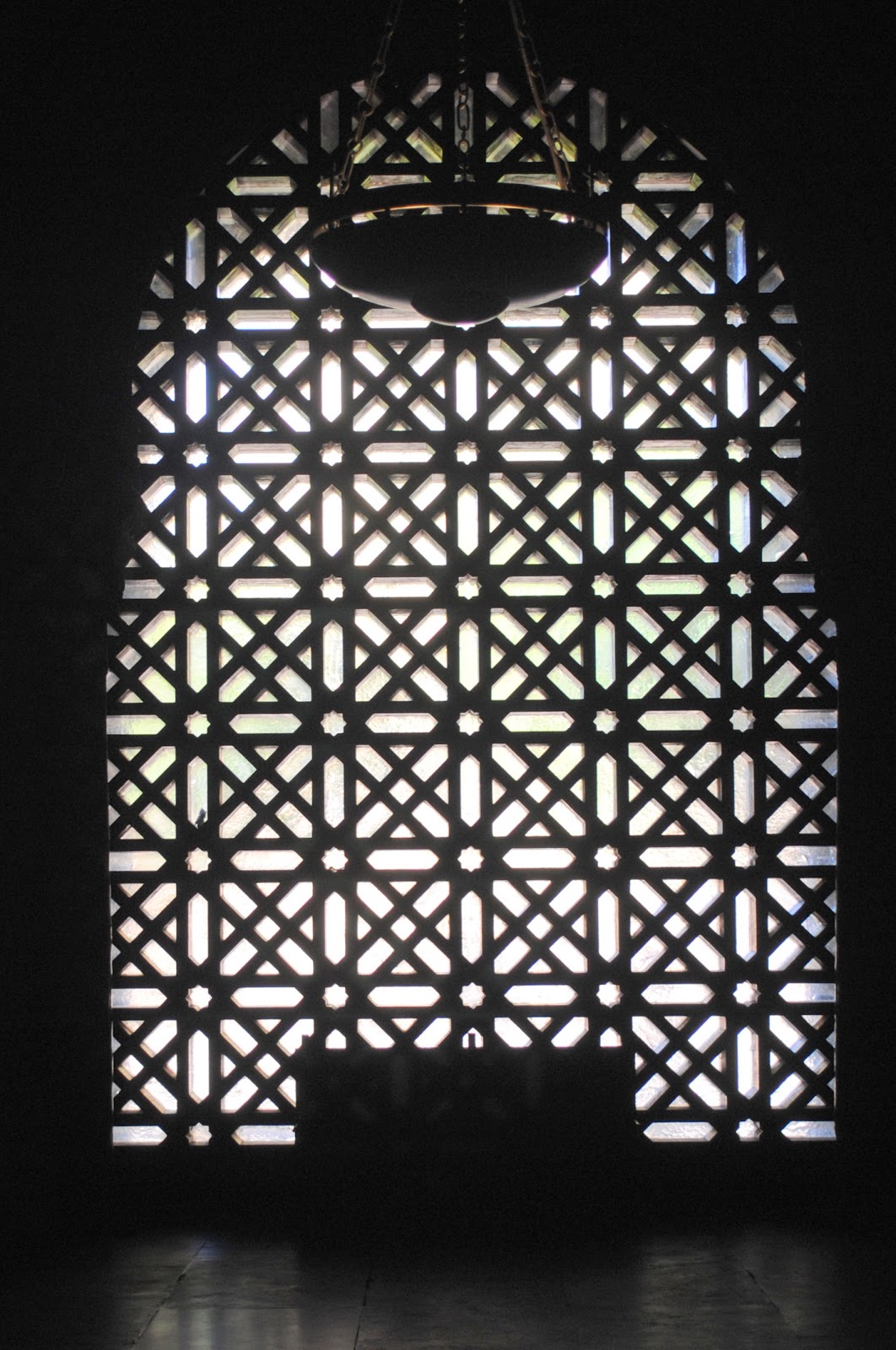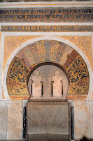 In the far corner (facing south, which is unusual) is the Mihrab, the mosque equivalent of a high altar. Muslims faced the Mihrab, a fixture in all mosques, to worship. Ornate as all Arabic architecture, the photograph doesn’t capture the beauty of three thousand pounds of glass and enamel decorate it.