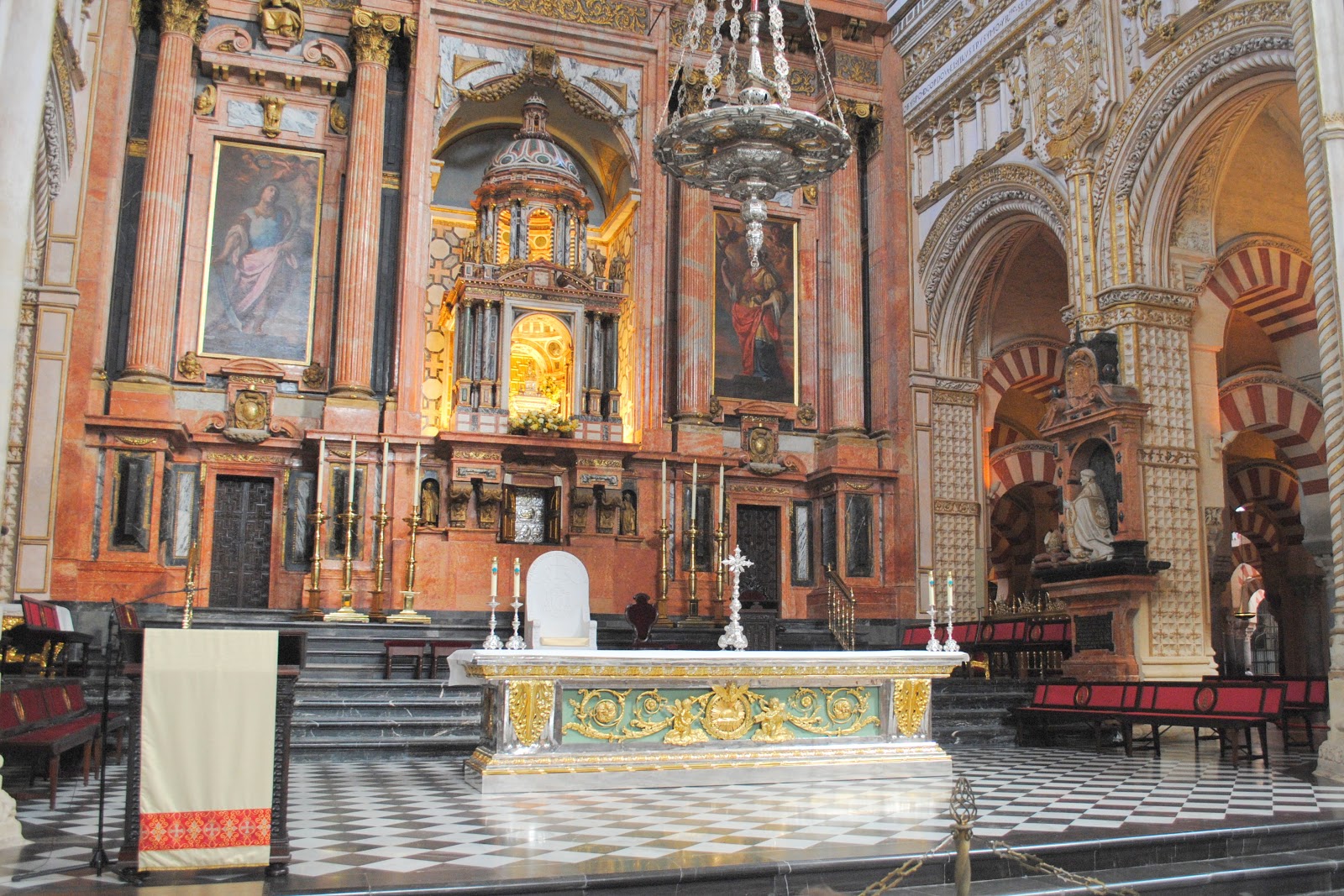In the center of the room, sixteen columns were removed to make a chapel, fronted by the Royal Chapel—a burial place for kings—never opened to the public. However, Córdoba was kind, and the chapel is not entirely walled off. The dome and the walls can be glimpsed—stunning.