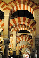 The Mezquita—no picture we have can do this justice. It was a church in Visigoth times, turned into a mosque and returned to a cathedral. When you enter the cathedral, 850 red and blue columns surround you, a visual forest—too dark and too grand to capture in a photograph. At one time, archways opened to the Patio de los Naranjos let light pour in. When made into a cathedral, beautiful windows filled in the archway.